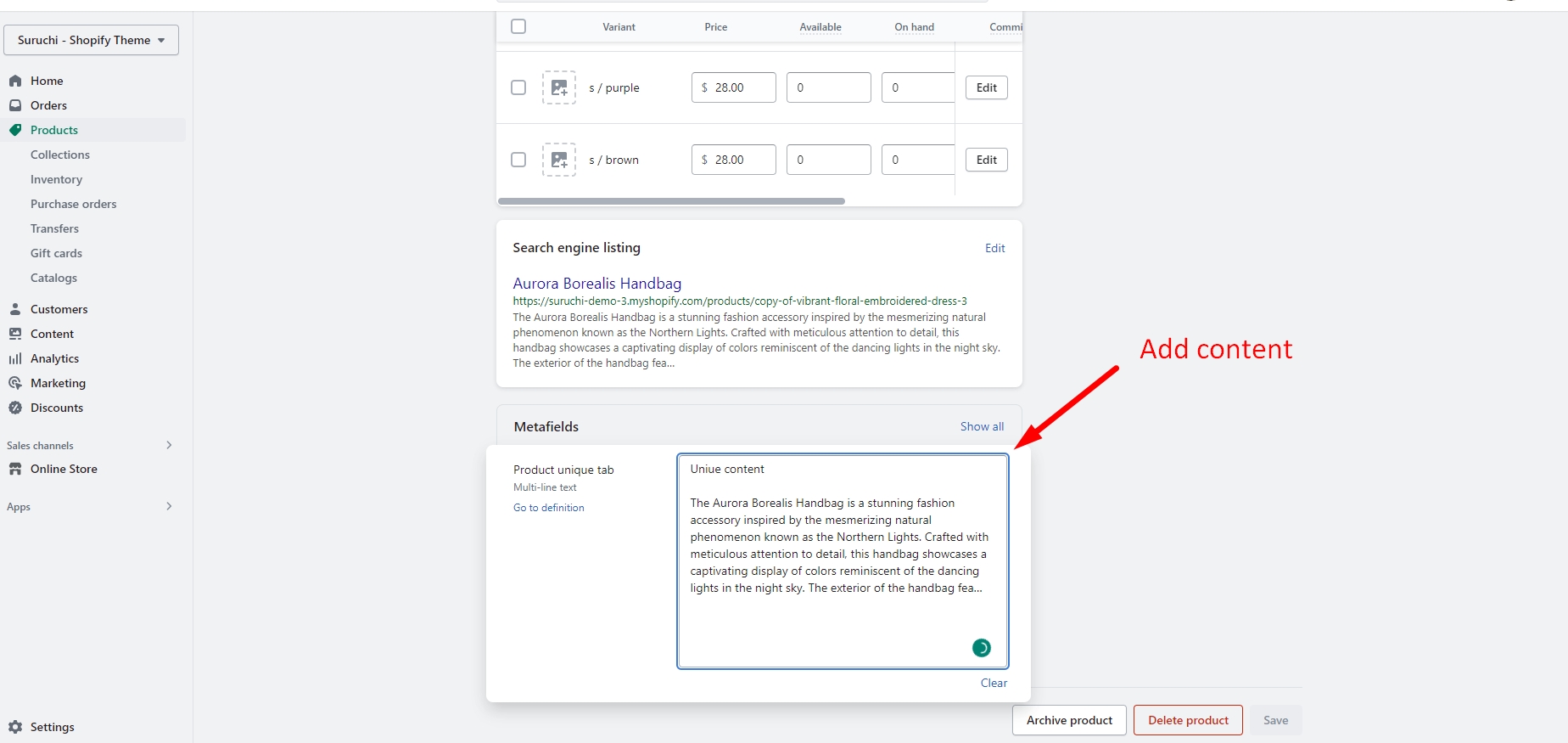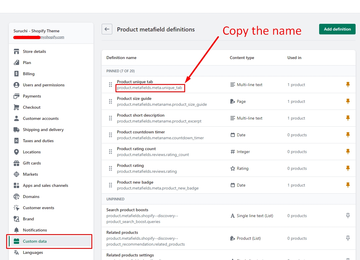 To navigate the Metafields - go to the Settings > Customer data > Products