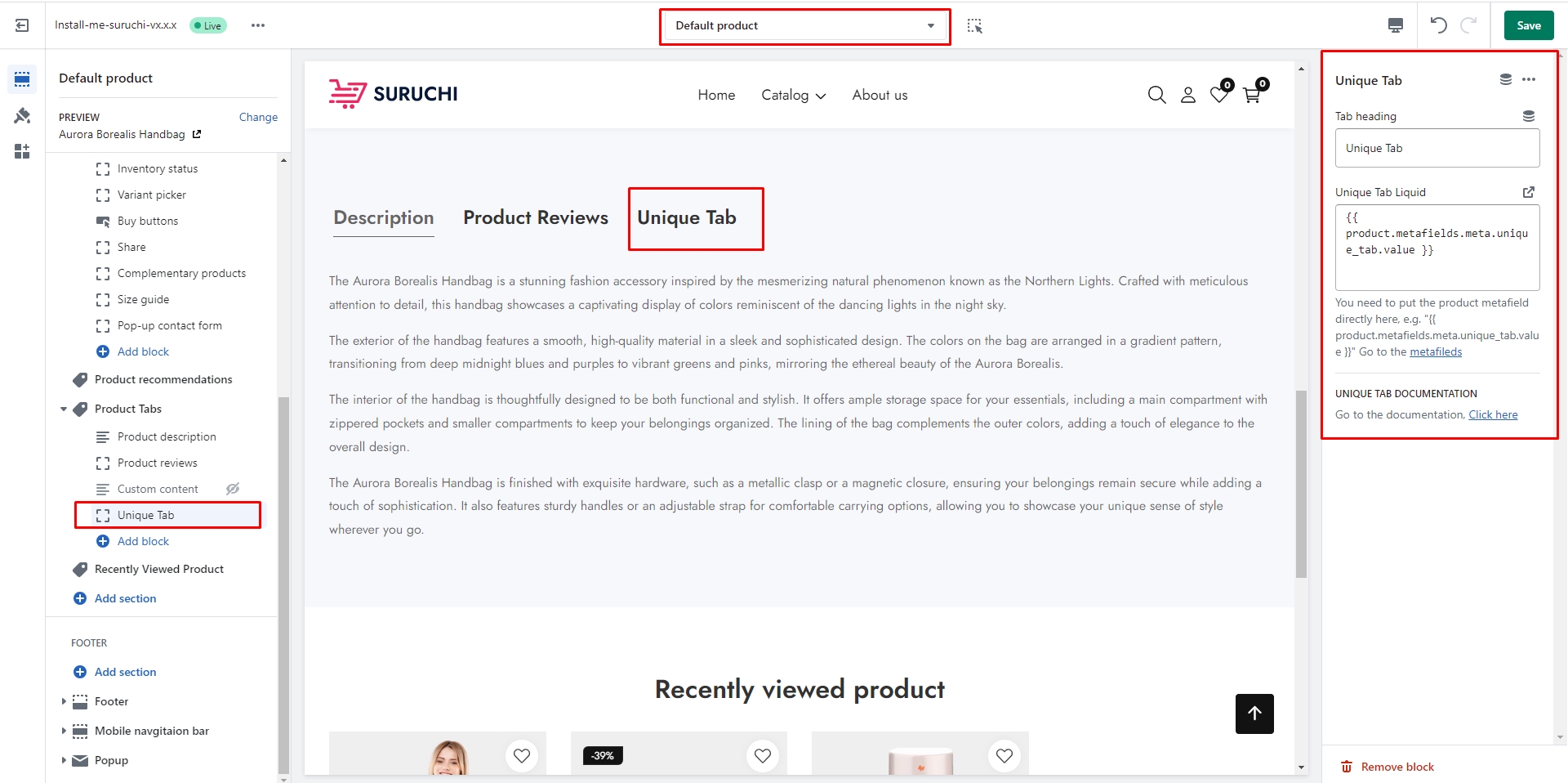 You need to put metafield liquid code for this setting "Unique Tab Liquid" if you have created a meatfield for the unique tab. Example code: