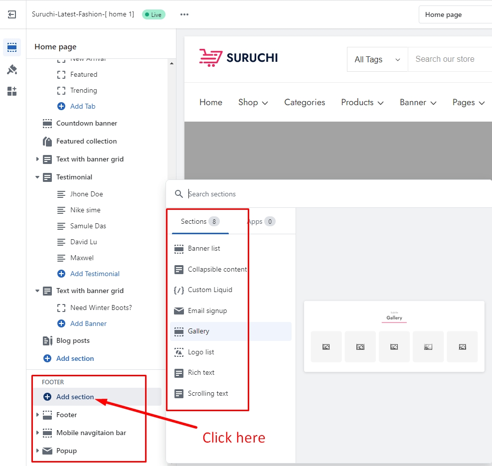In the theme editor, you have the ability to customize the footer group. This includes adding sections, removing them, and rearranging them. Also on the footer group, you have sections to customize the Email popup & Mobile Navigation bar