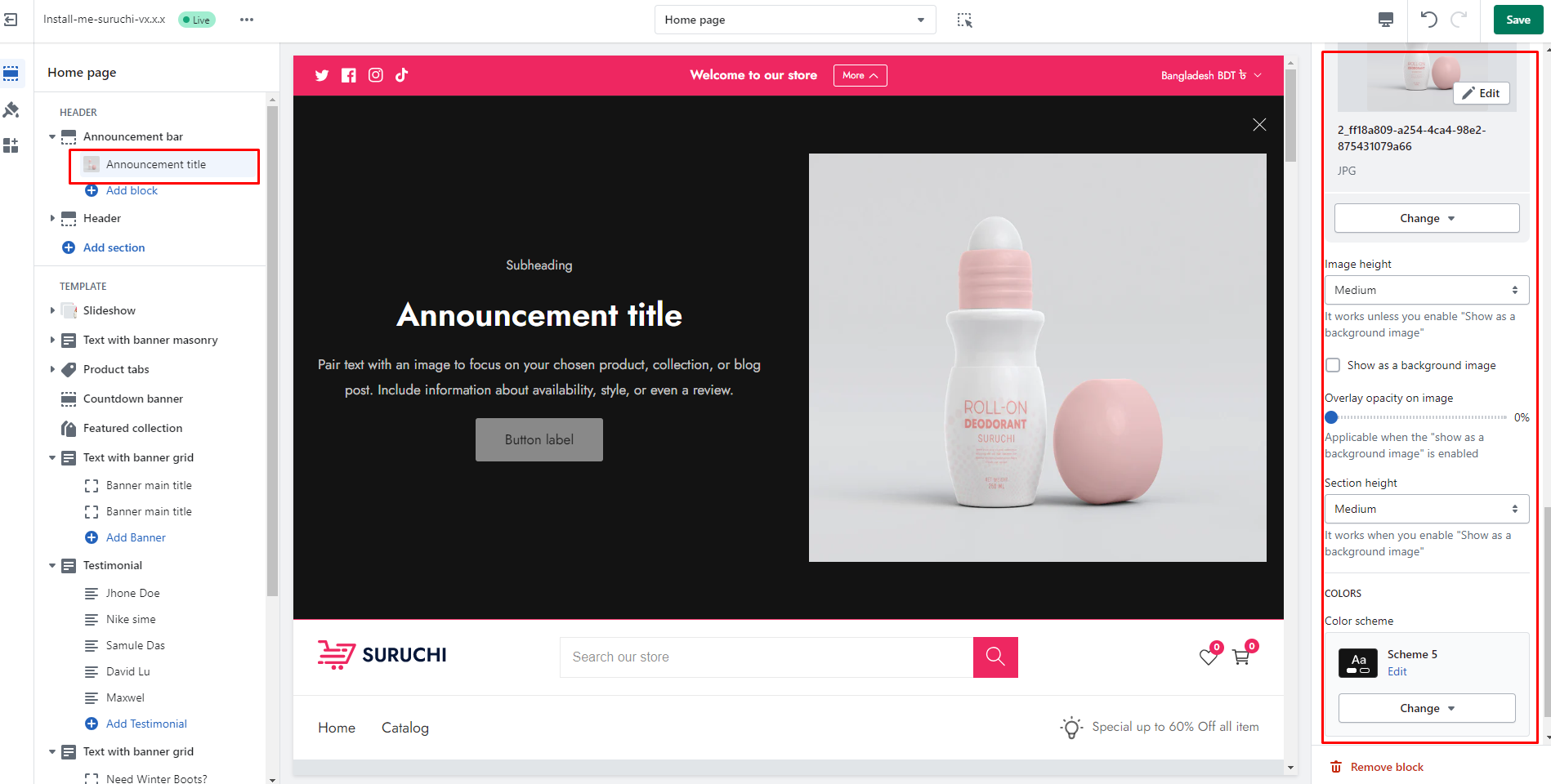 You have the flexibility to position the Announcement bar either above the Header to display it at the very top of a page or below the specified section. Simply use the drag-and-drop feature to place the section in the desired position.