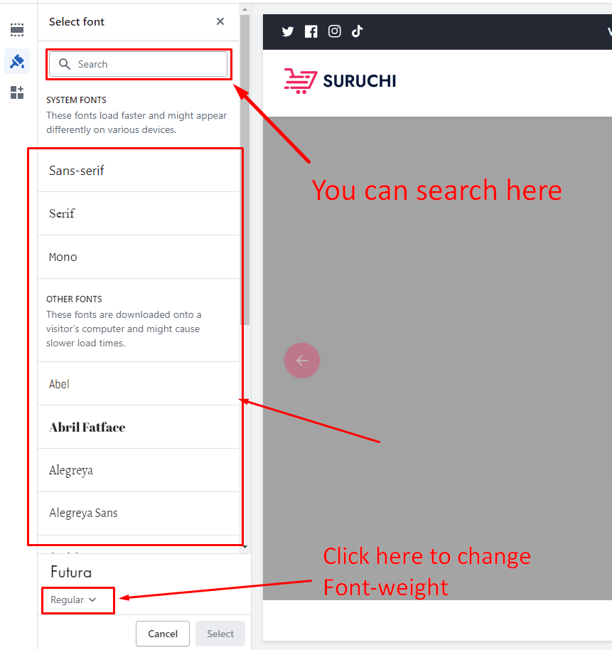 You have two options when it comes to selecting fonts for your website: utilizing the pre-existing fonts available in the library or using custom fonts. If you prefer to use custom fonts, please follow the steps outlined below: