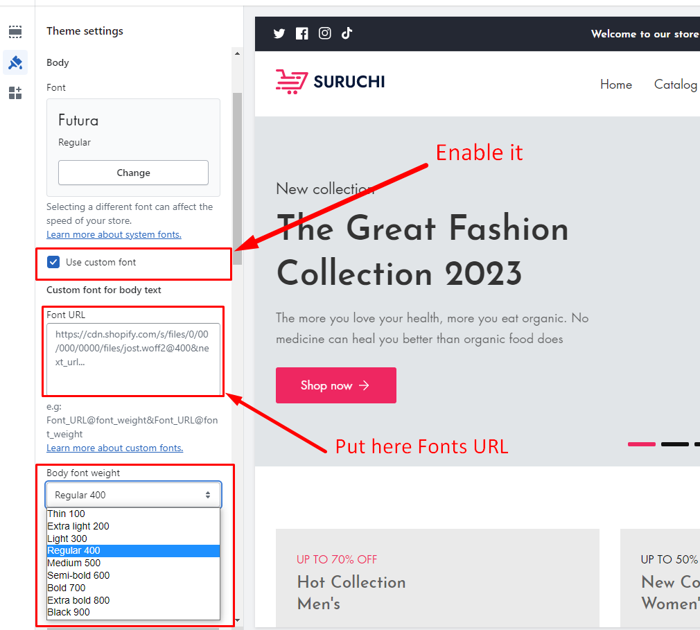 2. Following the format, "Font_URL@font_weight&Font_URL@font_weight" Put the URL in the "Font URL" field