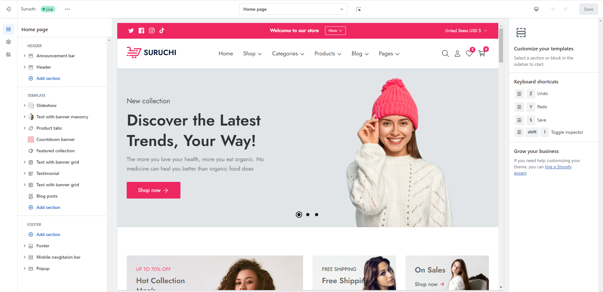 If you lack familiarity with coding languages, Suruchi is an ideal solution for you. It offers a multitude of pre-built features and sections, allowing you to effortlessly create a fully functional store from scratch that aligns perfectly with your niche, without the need for additional coding.​