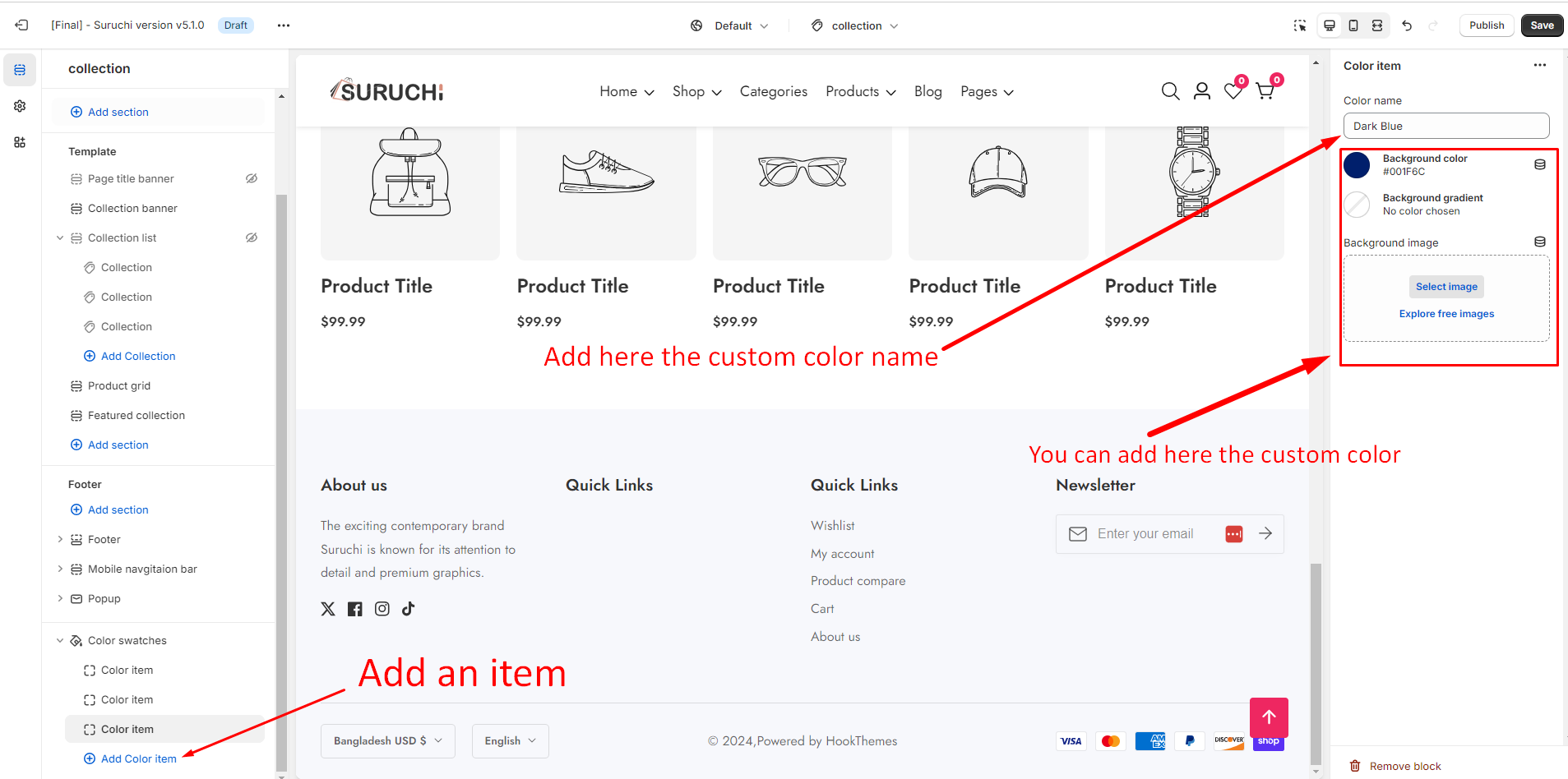 | **Color swatch activation**            | <p>Define the color option name. Eg. <strong>Color, Colour</strong>, etc.</p><p></p><p><strong>The name you used for the variant color option name must be entered exactly as it was there.</strong></p><p></p><p><img src="https://502474181-files.gitbook.io/~/files/v0/b/gitbook-x-prod.appspot.com/o/spaces%2FiCZ4jNa471odH4EhZvrK%2Fuploads%2FDvugaO4j1xXWPyfuxWRZ%2Fcolor_option_name.png?alt=media&#x26;token=6e760ddd-5038-45e7-b3a3-e32a3f7fdee2" alt="" data-size="original"><br></p> |