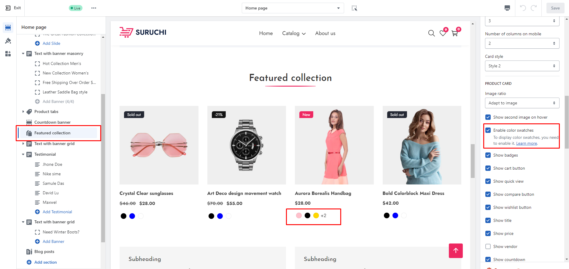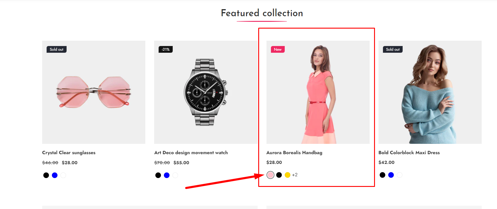 | **Enable color swatches**              | Color selections are displayed in swatches on the product card, allowing you to swiftly select.                                                                                                                                                                                                                                                                                                                                                                                                 |