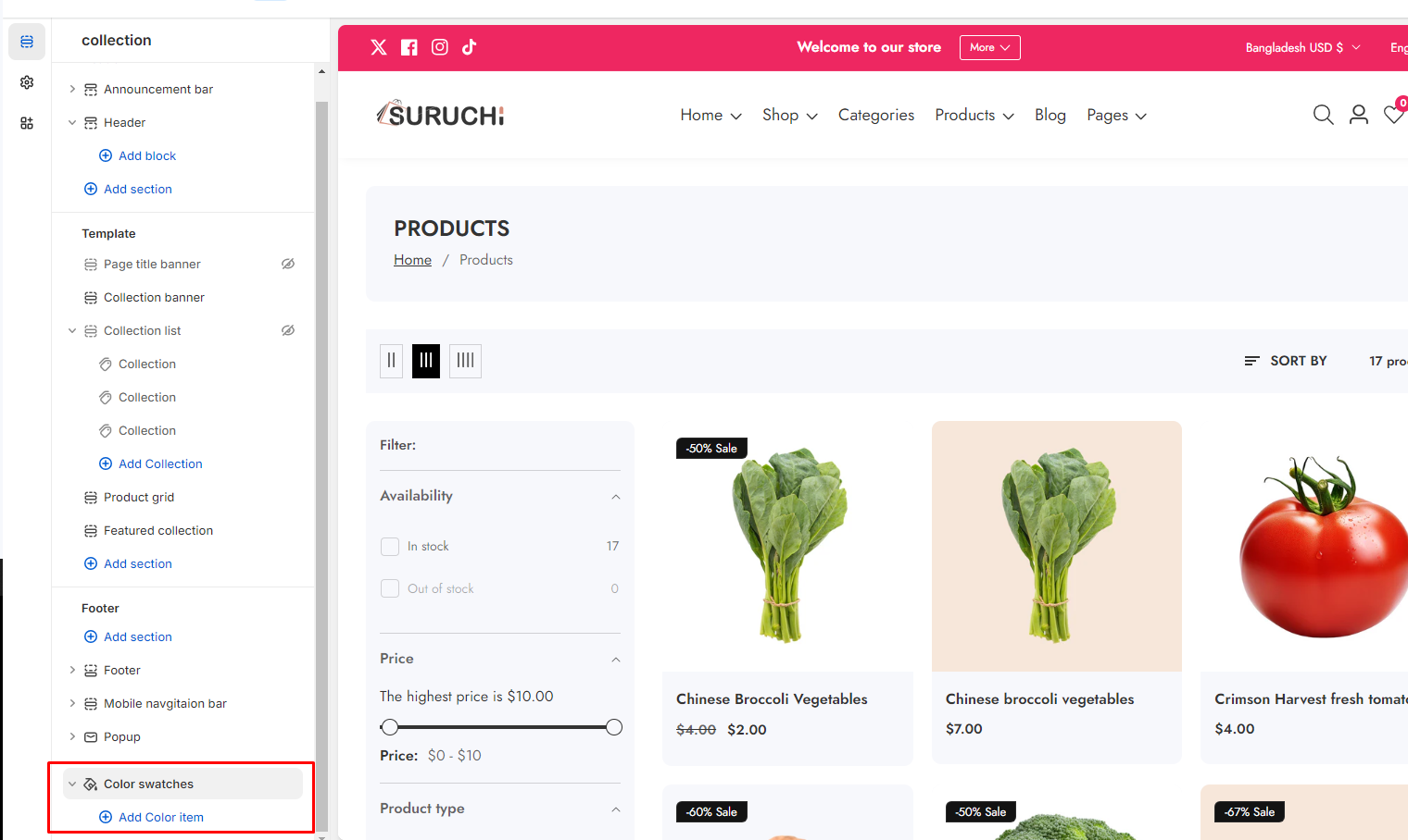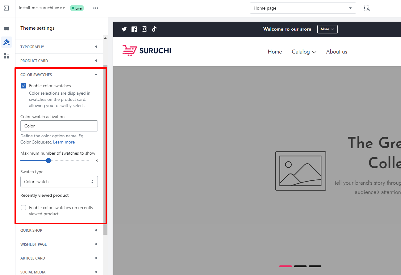 1. In the theme editor (**Customize**), click on the **Color swatches** Section